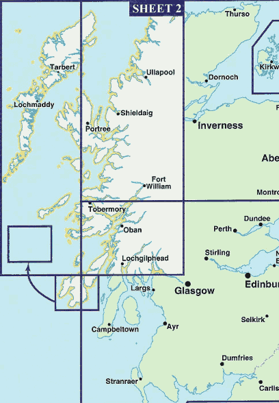 This map is "Sheet 2" and covers the area of the Scottish Highlands, Mull, Isle of Skye and Western Isles marked in white. Includes place name index, ferry crossings and tourist attractions.